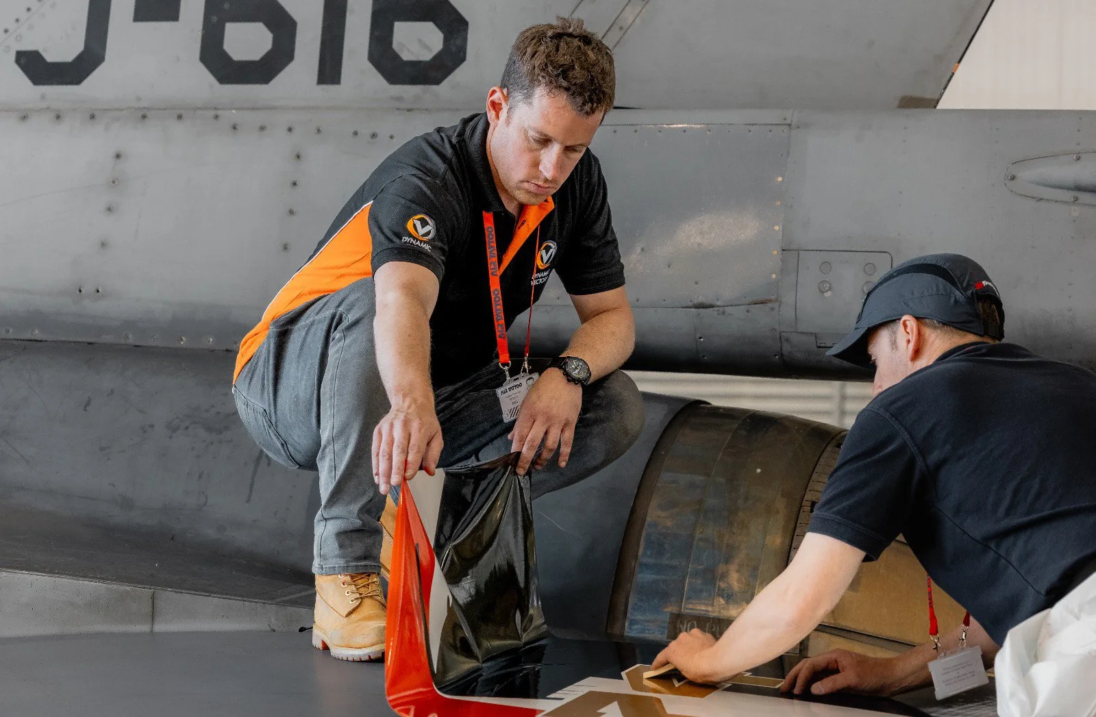 Over five days in early July, three weeks ahead of RIAT 2024, the mammoth project began. With the help of local subcontractors and industry partners Serco, the design began to come to life. The wrapping team consisted of Graham Hall, Ian Moore and Andy Donovan.